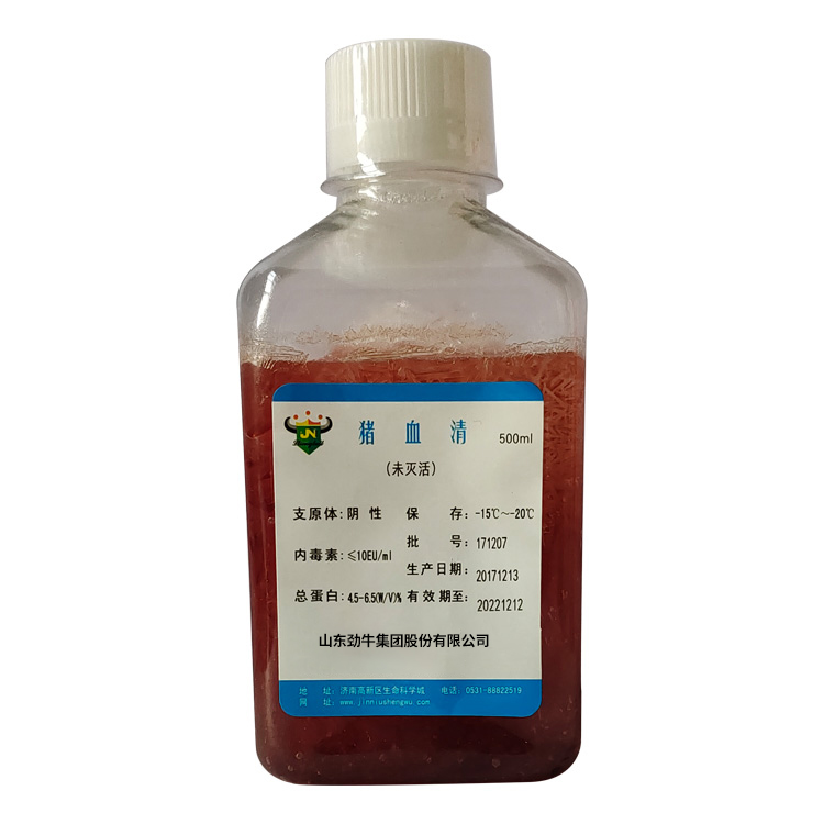 豬血清:系采用健康豬血液為原料,經(jīng)采集、分離、多級微孔濾膜過濾除菌和適宜劑量60Co照射。本產(chǎn)品無支原體、病毒和細菌, 內(nèi)毒素小于10EU/ml。適用于豬肺炎支原體等多種微生物的培養(yǎng)。